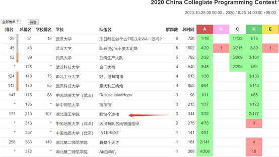 本次竞赛,共有6所湖北高校参加。虽然我院队伍离奖牌只有一步之遥,但也看到强队林立,竞争激烈。第一次参加算法竞赛方面高水准的竞赛,为团队积累了宝贵的经验,相信随着学生算法水平的进一步提高,在未来的竞赛中会取得更好的成绩。